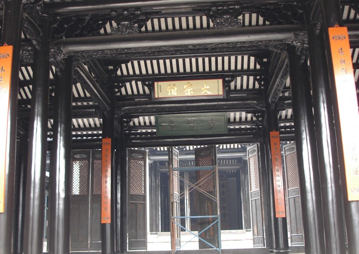 進(jìn)深達(dá)17米多,在古祠中是少見的,正中一前一后懸“大宗伯”、“象賢堂”兩塊紅漆金字木匾。“大宗伯”指的是沙灣燈廠第二代何起龍,明朝洪武年間任禮部尚書。禮部尚書當(dāng)時人稱“大宗伯”。“象賢堂”是紀(jì)念沙灣何氏的宗祖何德明(號象賢)而設(shè)。象賢堂由4條石柱和24條兩人合抱的大木柱支撐,梁、枋、駝峰斗拱均有玲挑剔透的三紋鳥獸、花果蟲魚等復(fù)雜木雕,令人嘆為觀止。置身如此寬敞高挺的象賢堂,巨大的柱林更覺得肅穆莊嚴(yán),對前人的敬意不覺油然而生。