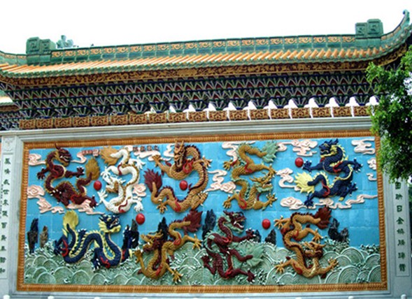 進(jìn)入南粵苑大門(mén),迎面是一幅大型的照壁——九龍壁,這是“龍翔鳳翥”美景。九龍壁下有雕花青石底座,上有“玉包金”琉璃瓦蓋頂,四周是白玉石欄河。九龍壁有著王者氣派,顯示中華民族龍的文化源遠(yuǎn)流長(zhǎng)。為了突出龍的形象,制作者采用浮雕技術(shù)塑造燒制,很有立體感。在海水、祥云的映襯下,九條分別為黃色、紅色、紫色、白色、藍(lán)色的巨龍,喜戲龍珠,形態(tài)生動(dòng),翻騰自如,有如遨游滄海,又似騰飛九霄。特別是在陽(yáng)光照射下,熠熠生輝,色彩斑斕,華美亮麗。