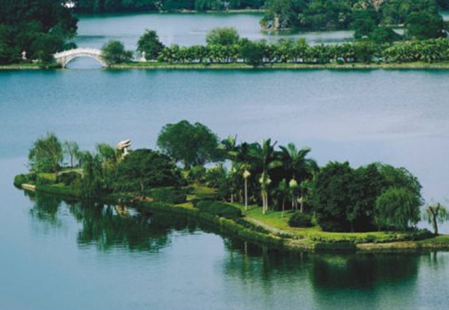 關(guān)于湖東東門塘的化容橋,有一個(gè)美麗的傳說(shuō)。相傳有一位其貌不揚(yáng)的姑娘,在桂山采桂花為生,一天她進(jìn)城賣桂花藥,正好碰上皇帝派人在湖邊搭臺(tái)選妃,觀看的百姓人山人海,姑娘也擠進(jìn)人群翹首觀望,誰(shuí)知一不小心被擠落水里。奇怪的是當(dāng)她被救起來(lái)后,變得如出水芙蓉,艷驚眾人,于是當(dāng)場(chǎng)被選入皇宮。此后,湖上的這座橋就被叫作化容橋(也稱化龍橋)。當(dāng)然這只是傳說(shuō),但也反映了河源的水水質(zhì)之好,河源人的愛(ài)美之心自古有之?;垬蚰鲜乔塾兄碌娘w鸞橋,橋上花草如茵。此橋的特別之處在于并不貫通兩岸,游人走到橋尾,正好身處湖心,坐在亭中,享受著柔和的微風(fēng),看湖水泛起陣陣漣漪,湖岸上的熱鬧就在眼中,卻并不鬧耳,很容易生出一種超然物外的感覺(jué)?;輼蛭鱾?cè)原有兩棵古榕,現(xiàn)在只剩下一棵。另一棵本有兩枝,版權(quán)所有山東聊城聊之旅國(guó)際旅行社有限公司,轉(zhuǎn)載必究!在朱德委員長(zhǎng)逝世前無(wú)緣無(wú)故坍裂了一枝,而另一枝也在毛主席逝世前無(wú)緣無(wú)故連根倒塌了,不知道這是巧合還是天意。