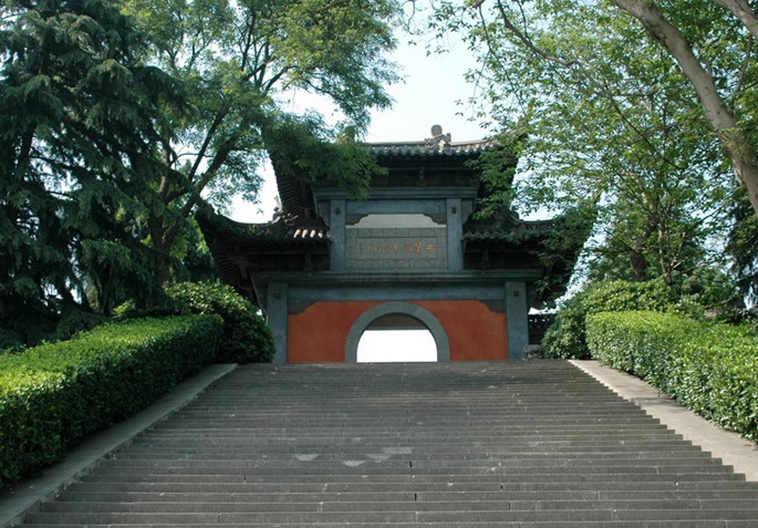 享殿后是墓區(qū),通往墓臺的石板神道為古松掩映,旁立4對石人石獸,粗獷簡約,典型的明代雕塑風(fēng)格。墓臺四周有仿白玉欄桿,中立“西楚霸王衣冠家”碑石一方。墓成橢圓狀,左側(cè)有地下墓道。