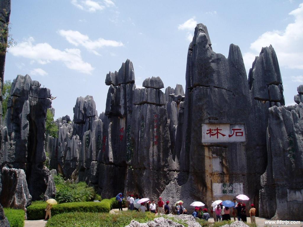 石林位于昆明市東,是世界罕見的風景名勝,是大自然鬼斧神工的杰作。在路南廣達400平方公里的區(qū)域內,遍布著上百個黑色大森林一般的巨石群。有的獨立成景,有的縱橫交錯,連成一片,占地數十畝,上百畝不等。最典型的一片叫李子營石林,只見奇石拔地而起,參差峰巒,千姿百態(tài),巧奪天工,被人們譽為“天下第一奇觀”。