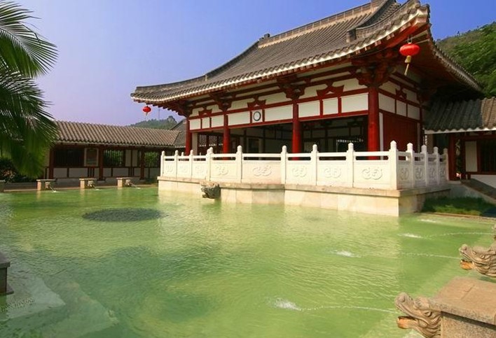 龍?jiān)礈厝燃俪俏挥趽碛小皽厝肌泵雷u(yù)的河源斷裂地帶的中段,背靠由珍貴的水晶石構(gòu)成的“水晶山”,溫泉水從地下100多米深處透過古老的水晶巖層涌出,水質(zhì)更具靈性,富含40多種礦物質(zhì),硅酸、鋰、鍶、鋅、二氧化碳等珍貴地?zé)岬V泉水。龍?jiān)礈厝燃俪菗碛?3 個純天然泉眼,勘測日流量近萬噸,溫泉水資源十分豐富,最高溫度68℃,具有良好的增強(qiáng)免疫力,活化細(xì)胞,養(yǎng)顏瘦身等保健療效。