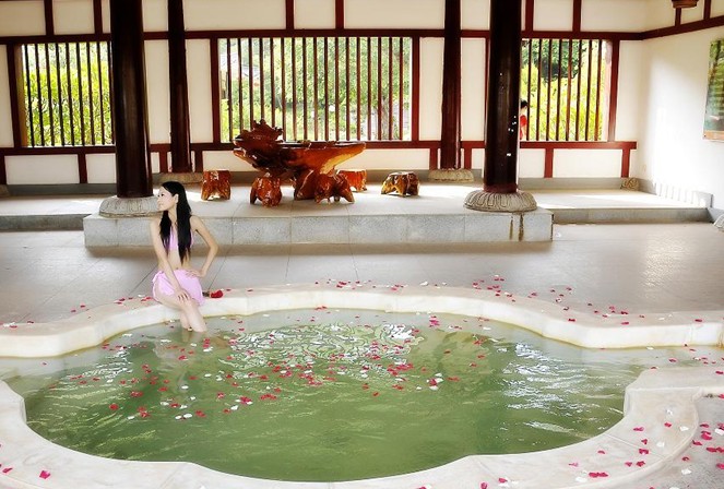 龍?jiān)礈厝燃俪俏挥趽碛?ldquo;溫泉之都”美譽(yù)的河源斷裂地帶的中段,背靠由珍貴的水晶石構(gòu)成的“水晶山”,溫泉水從地下100多米深處透過古老的水晶巖層涌出,水質(zhì)更具靈性,富含40多種礦物質(zhì),硅酸、鋰、鍶、鋅、二氧化碳等珍貴地?zé)岬V泉水。龍?jiān)礈厝燃俪菗碛?3 個純天然泉眼,勘測日流量近萬噸,溫泉水資源十分豐富,最高溫度68℃,具有良好的增強(qiáng)免疫力,活化細(xì)胞,養(yǎng)顏瘦身等保健療效。