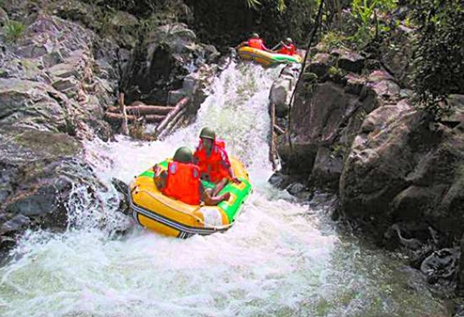油田礦泉漂流最大的賣點(diǎn),是其中的高臺(tái)沖水之漂,據(jù)聞屬于首創(chuàng)。漂流水道落差變化莫測(cè),漂流者的橡皮筏在急流中時(shí)沉?xí)r浮,從3米高的水道中飛奔而下,人和筏子沖到水底去了,瞬間又浮現(xiàn)了上來(lái),時(shí)而蜿蜒于峽谷叢林,或漂浮于天光云影之間。
