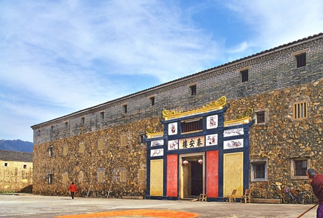 梅州泰安樓的建筑風格獨特,規(guī)模宏大,設(shè)計精巧,布局合理,功能齊全,文化內(nèi)涵豐富。從外表上看簡直不相信這會是住宅建筑,其極其封閉的外觀簡直像一座牢不可破的城堡。高大的泰安樓給人的第一印象是磐石般的穩(wěn)重、質(zhì)樸、粗獷。走進泰安樓,以祖堂為中心的“祖功宗德”橫匾,顯示了敬祖的思想和客家人對傳統(tǒng)的依戀,展現(xiàn)了客家人世代相傳和睦共居的獨特的生活方式,這種大家族聚居的建筑體現(xiàn)了客家人的族群意識,泰安樓向心的布局強化了家族內(nèi)部的凝聚力。