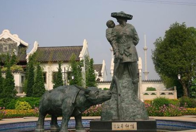《客家婦女》雕像,高3.9米,整個(gè)雕像以青銅灌注而成,以一位頭戴涼帽,身穿大襟衫,背著小孩,乎扶犁耙,赤足在田野耕作的傳統(tǒng)客家婦女形象為主題,它象征著客家女的溫柔、善良、孝順、勤勞、賢惠。