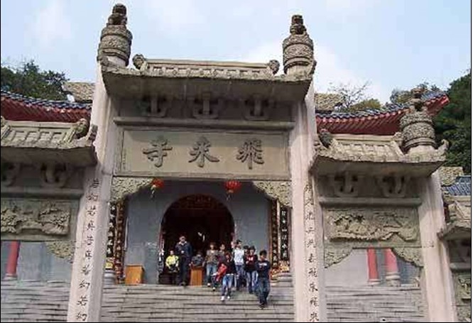 該寺位于廣東清遠市北江小三峽處的飛來寺,相傳是從安徽飛來,故名飛來寺。相傳在梁武帝普通元年(公元520年),軒轅黃帝的兩個庶子太禺和仲陽隱居在飛來峽。一個月明之夜,他們邊飲酒、邊作樂、邊欣賞眼前這峰巒疊嶂、江水凝碧、漁火點點的夜色時,總是感到有點美中不足,缺少點什么東西?猛然間醒悟:對,就是缺少一個道場,當即,他們駕起祥云,來到安徽舒州上元的延祚寺,對住持貞俊禪師說:“峽居清遠上游,千峰拱主,悉若佑命,所稱福地是也。吾欲建一道場,立勝概,師居乎?”貞俊禪師不好拒絕,也不好作答,只是微點了下頭。夜靜,太禺與仲陽作法,一時行雷閃電,風雨大作,把整座延祚寺凌空拔起搬往廣東。次日,貞俊禪師早起,發(fā)現(xiàn)寺院已在清遠峽山,心中不悅,口中念念有詞:“寺能飛來,胡不飛去?”空中傳來話語:“動不如靜!”從此,這寺院就落地生根,留在了飛來峽。