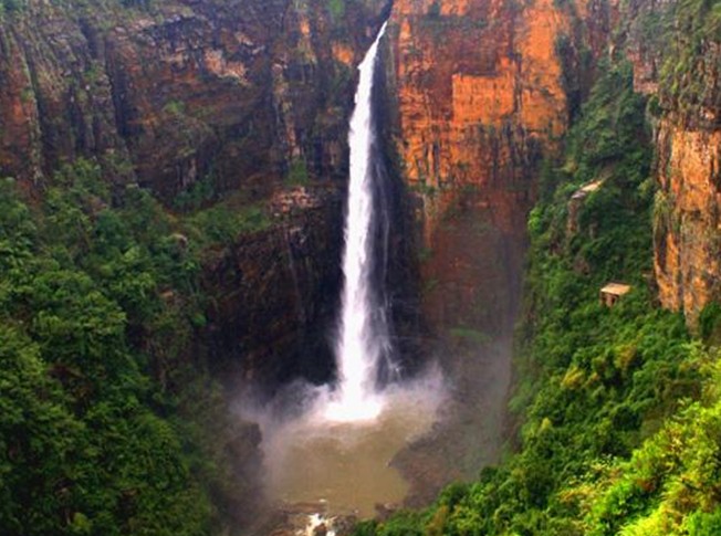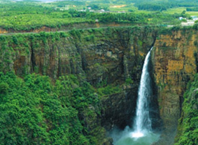 峽谷頂部地貌平緩,壺口瀑布從200多米的懸崖峭壁飛流直下,形成了氣勢磅礴的山水奇觀。另有一條坡度達(dá)50度斜角的1386級石階的“通天梯”可達(dá)谷底。峽谷溝壑縱橫,奇峰林立,古木參天,構(gòu)成一幅巧奪天工的山水畫卷。