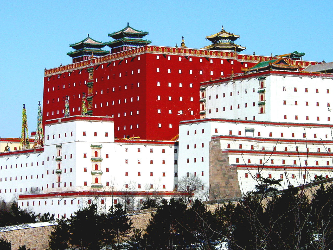 普陀宗乘之廟是仿西藏拉薩布達(dá)拉宮修建的,“普陀宗乘”是藏語“布達(dá)拉”的漢譯。廟依山建造,坐北朝南,山門內(nèi)是碑閣,北是五塔門,版權(quán)所有聊城聊之旅國際旅行社有限公司,轉(zhuǎn)載必究!高十余米,有拱門三個(gè),上建紅、黃、黑、白、綠五座喇嘛塔。門北是琉璃牌坊。牌坊北地形漸高,各式白臺(tái)、塔臺(tái)建筑因地形而散置,高低有別,變化多端。最后為雄偉高大的主體建筑大紅臺(tái)。大紅臺(tái)的正面,下面是高達(dá)十八米的大白臺(tái),其上聳立著高達(dá)二十五米的大紅臺(tái)。紅臺(tái)內(nèi)四周為三層群樓,中央是重檐攢尖鎏金銅瓦項(xiàng)的“萬法歸一”殿?!∑胀幼诔酥畯R布局分三個(gè)部分:前部包括山門、碑亭、五塔門;中部包括琉璃牌坊、白臺(tái)、僧房等;后部是主體建筑大紅臺(tái)及周圍其他建筑,大小共60余處,被包圍在雉堞銜連、依著山勢(shì)起伏而環(huán)寺一周的高大圍墻之內(nèi)。