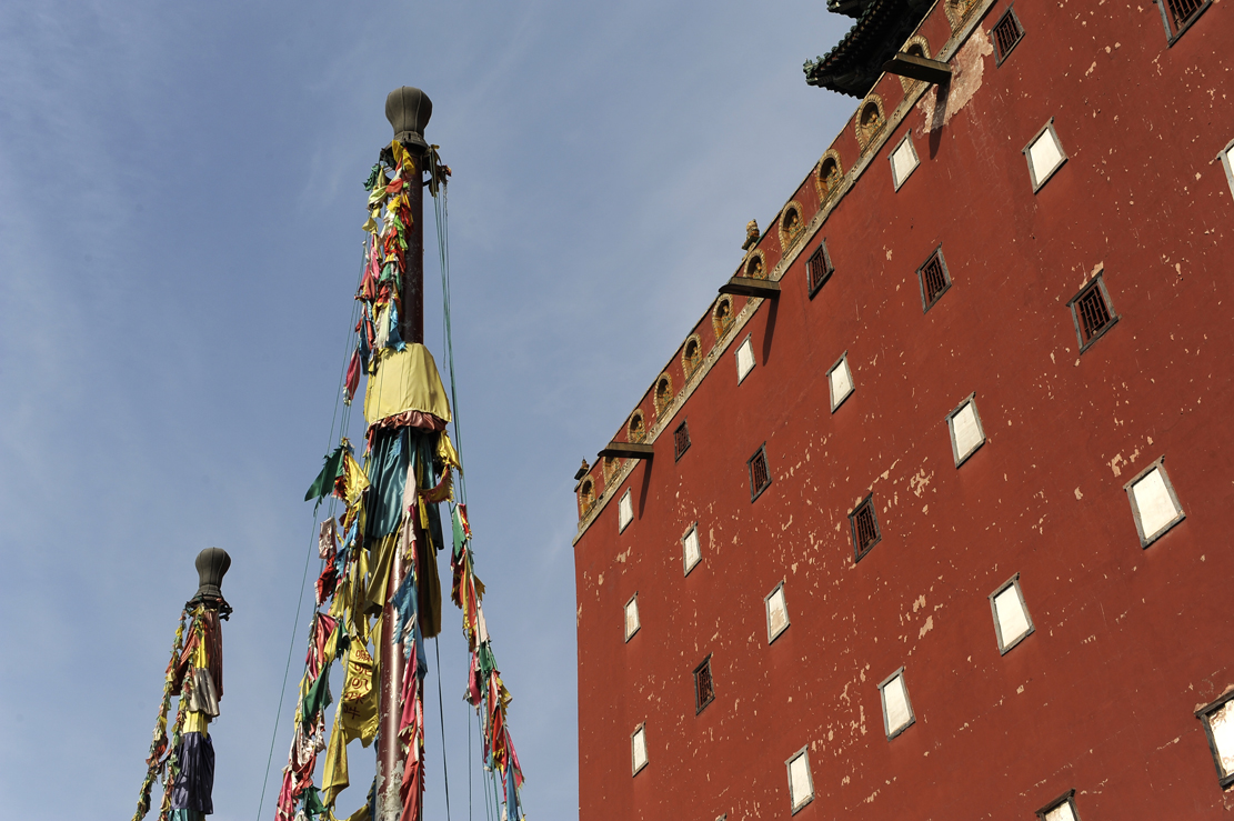 大紅臺(tái)南面正中嵌飾垂直琉璃佛龕六個(gè),黃綠相間,版權(quán)所有聊城聊之旅國際旅行社有限公司,轉(zhuǎn)載必究!漢式手法,一是標(biāo)記軸線,二起裝飾作用。紅臺(tái)頂部砌女兒墻,墻下三面 (東、西、南)裝飾黃琉璃佛龕,拔檐石下置排水長(zhǎng)槽。紅臺(tái)內(nèi)里五至七層為三層閣樓,每層44間,四面合圍,亦稱群樓。