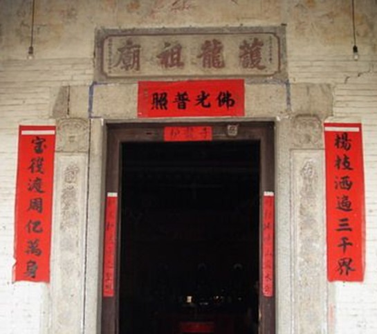 護龍祖廟在端州區(qū)黃崗鎮(zhèn)前村,始建于清初,同治十年(1871)重修。四周古樹懷抱,環(huán)境清幽,有小溪潺潺流過,廟前遠眺,田園秀色一覽無遺。廟為三進院落四合院式布局,面積136平方米,大門上方鑲嵌楷書“護龍祖廟”石匾,前后殿為硬山頂,面寬進深均三間,建筑物前設(shè)“低頭牽”,抬梁與穿十混合式梁架結(jié)構(gòu),兩殿之間以平面方形的卷棚頂廟亭相連,亭兩側(cè)空地邊緣,還用矮墻連貫前殿與后殿,使之渾然一體。該廟是肇慶市端州區(qū)目前保存最完整的廟宇。1984年公布為肇慶市文物保護單位。