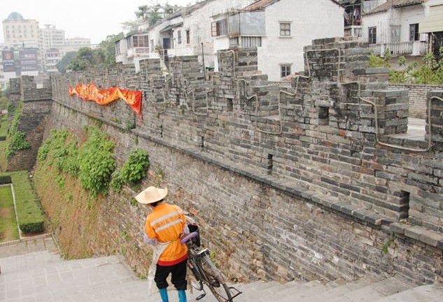 廣東僅存的完整古城墻,位于肇慶市區(qū)內(nèi)人民南路一帶,始建于宋代,呈長方形,周長280 .2米,制高點在城北披云樓。目前城墻高出地面10米,城墻兩側(cè)由磚砌成,中間夯土,外圍共有28個城垛,城磚規(guī)格達(dá)40多個品種,是歷史上曾多次修葺的見證。當(dāng)年廣西壯族首領(lǐng)儂智高反宋,端州太守丁寶臣因無城墻防守,棄城而逃。儂智高失敗后,官府于公元1053年始筑土城墻,至明末共修城墻十一次。