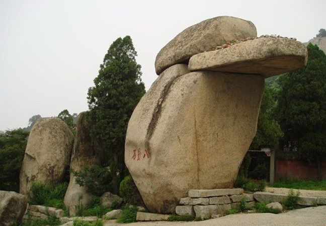 八卦石 八卦石是古代嶧山的五大奇觀之一。奇就奇在這兒原來(lái)有八塊大石頭,由東向西依次排列,高度相當(dāng),每塊石面都有斷紋。八塊石頭的斷紋正好與《周易》八卦的卦爻相吻合。非??上У氖?,清雍正四年(1726年)修奎星閣毀掉了幾塊石頭。嘉慶十二年(1807年)拓建通明天宮戲樓,又毀掉了幾塊石頭。現(xiàn)在只能看到乾、坎、艮三卦的卦爻了。