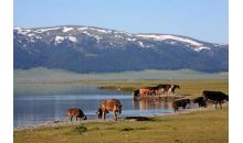 鴨澤湖位于喀納斯村南邊,它是由喀納斯河改道后廢棄河段——牛軛湖洼地組成,呈長形蝶狀,沿洼地南端形成一個南北走向的寬淺湖泊,形似蝶狀的一弘碧水與沼澤濕地連為一體,長3km,寬600~800m,面積約1.3 平方公里,湖周開闊平緩,湖泊似鏡。湖水與周圍開闊的沼澤濕地和河谷草原上,棲息著種類繁多的禽鳥,成群的野鴨、大雁和天鵝等也時常光顧此地,它們在寧靜的水面上安閑的游戈。據(jù)說,當野鴨群被驚動時,便會看到它們一只只、一批批漸次飛起,翅膀拍打著水面,十分壯觀。也許是季節(jié)的關系,我們沒能看到成群的野鴨,但卻看到碧綠的草地環(huán)繞明鏡般的湖水,寧靜秀美,廣袤的沼澤草原上,牛羊在游閑覓食,白色的蒙古包星星點點,帳篷前的地灶上,炊煙裊裊,與青山和白云構成一幅天然的巨型山水畫,令人賞心悅目。