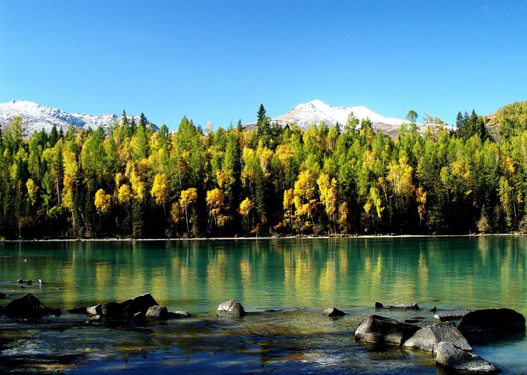 喀納斯湖會(huì)隨著季候和天氣的變化時(shí)時(shí)變換著自己的顏色:或湛藍(lán)、或碧綠、或黛綠、或灰白……有時(shí)諸色兼?zhèn)洌瑵獾嚅g,成了有名的變色湖。受強(qiáng)勁谷風(fēng)的吹送,倒入喀納斯湖的浮木,會(huì)逆水上漂,在湖的上游湖灣處聚堆成千米枯木長(zhǎng)堤,蔚為喀納斯湖的一大奇觀。