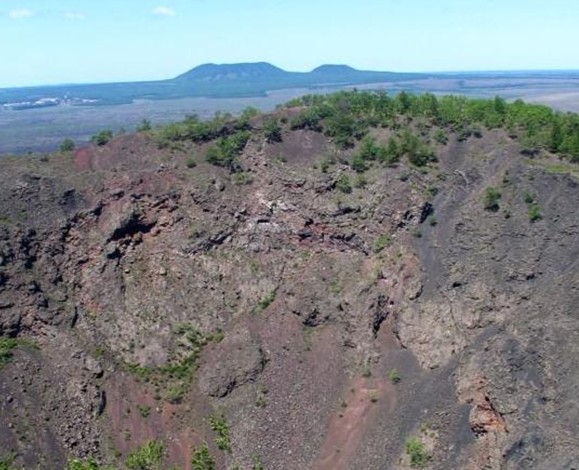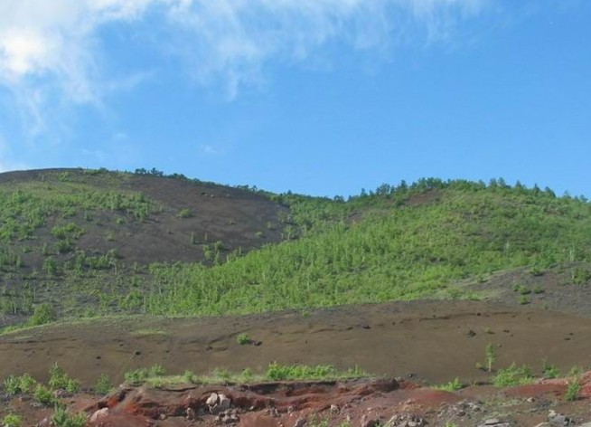黑龍山南坡覆蓋的是火山礫,也稱(chēng)火山灰?;鹕降[是氣體噴發(fā)的產(chǎn)物,當(dāng)巖漿中氣體特別充沛時(shí),就噴發(fā)出泡沫狀的熔巖,冷凝后,隨著風(fēng)向散落在火山周?chē)8鶕?jù)火山礫的分布情況,可以推測(cè)火山噴發(fā)時(shí)這里刮的是北風(fēng)或西北風(fēng)。山體由早、晚兩個(gè)火山錐體套疊而成,早期的錐體被晚期的噴發(fā)破壞并占據(jù),從植被的疏密上可以看出早晚的差別,它是一座休眠活火山。