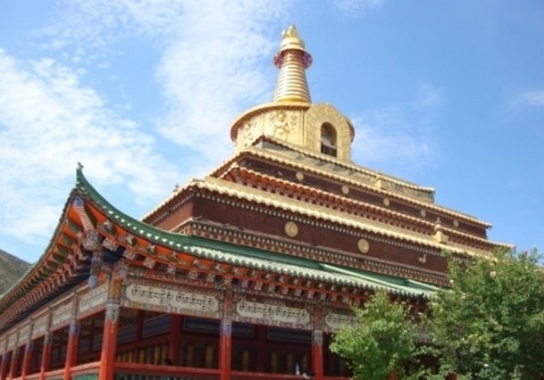 拉卜楞寺西南角,由三世貢唐倉•貢曲乎丹貝仲美大師建成于1805年,原名現見解脫大金塔,因塔內供有從尼泊爾迎請來的無量光佛(阿彌陀佛)像而享譽海內外,寶塔造型別致,工藝精巧,在建筑藝術與宗教意義上達到了完美神圣之境界。現存寶塔由六世貢唐倉•丹貝旺旭大師為丕振宗風,宏教利民,而于1991年2月8日在原寶塔遺址舉行凈地儀軌,主持籌建。工程竣工于1993年7月,于佛祖釋迦牟尼初轉法輪的殊勝節(jié)日舉行了開光永存儀式。貢唐寶塔高五層,31.33米,塔呈菩提式,版權所有山東聊城聊之旅國際旅行社有限公司,轉載必究!占地2144.16平方米,由塔剎、塔瓶和塔座組成。塔剎是日、月、星辰;塔瓶是精銅浮雕鎏金八大菩薩;塔座是琉璃瓦裝飾的三層四角形建筑。寶塔外形金碧輝煌,氣勢非凡,內部構造精巧,多寶嚴飾。塔內正中是二層相互貫通的四座佛殿,供歷世貢唐倉靈塔或木雕鍍金像,并藏有兩萬余卷佛經。殿頂供阿彌陀佛、二世嘉木樣和千佛銅像。貢唐寶塔與大夏河水、云杉禪林相映,矗然傲立,巍峨壯觀,現已對游人開放。