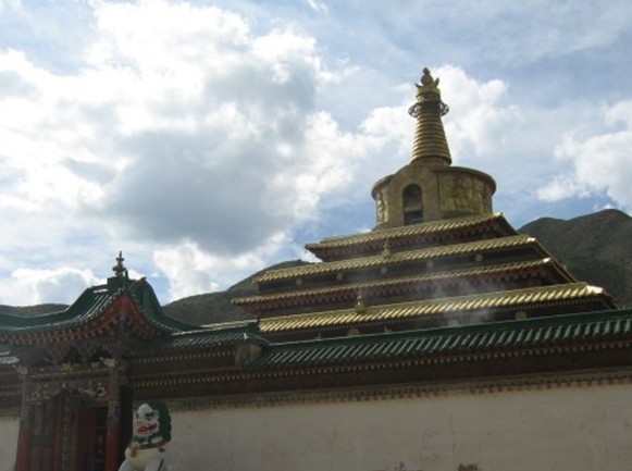拉卜楞寺西南角,由三世貢唐倉?貢曲乎丹貝仲美大師建成于1805年,原名現見解脫大金塔,因塔內供有從尼泊爾迎請來的無量光佛(阿彌陀佛)像而享譽海內外,寶塔造型別致,工藝精巧,在建筑藝術與宗教意義上達到了完美神圣之境界?,F存寶塔由六世貢唐倉?丹貝旺旭大師為丕振宗風,宏教利民,而于1991年2月8日在原寶塔遺址舉行凈地儀軌,主持籌建。