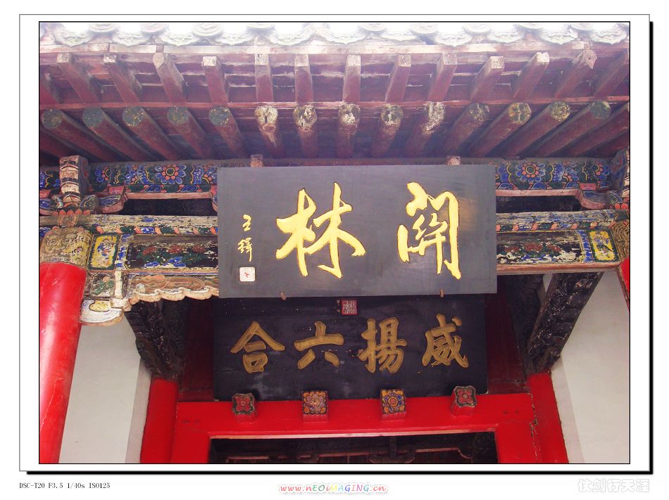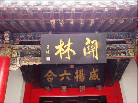 始建于明萬(wàn)歷二十四年(1596年),面闊七間,進(jìn)深三間,高26米。廡殿頂,琉璃瓦覆蓋,五脊橫立,六獸揚(yáng)威。正門上,有12幅明代浮雕木刻。說(shuō)的是桃園三結(jié)義,三英戰(zhàn)呂布等故事。