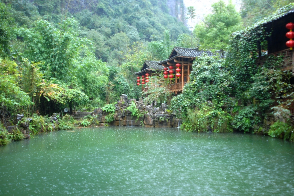 洞內(nèi)盆地有一終年不枯的泉眼,崖壁上若干小溶洞中,亦有泉水飛泄。桃花溪匯泉而成,溪水穿大酉洞流出,清澈見底,注入酉陽河。桃林夾岸,落英繽紛,溪畔有古雅的“問津亭”,為四角木質(zhì)小亭。