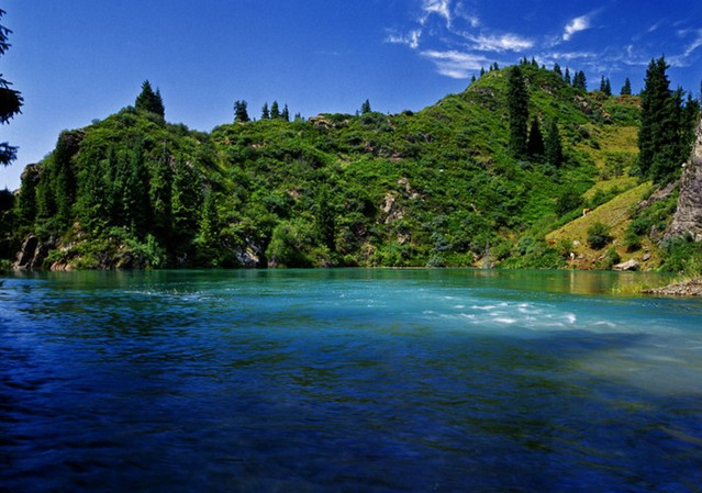 天山風(fēng)景名勝區(qū),位于東天山北坡,東起寒氣溝,西至松樹塘,南自天山廟,北接鳴沙山,總面積120平方公里,距哈密市約70公里,有省道(即絲路北新道)通往,交通通訊方便,既有巍峨的高山冰川、浩瀚的林海,也有一望無際充滿生機(jī)的大草原,還有草木不生光禿禿的鳴沙山(居全國四大鳴沙山響聲之首。