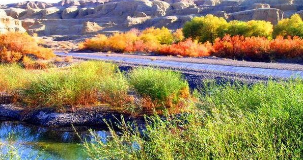 水流兩側(cè)是茂密的胡楊林,主要樹(shù)種有胡楊、銀灰楊、毛柳、尖果沙棗,灌木有鈴鐺刺、薔薇、柳。白刺等,草類(lèi)繁多,多為禾本科和豆科屬種。胡楊是新疆古老和珍奇的樹(shù)種之一,是荒漠中河岸林的優(yōu)勢(shì)樹(shù)種,具有抗干旱、御風(fēng)沙、耐鹽堿的能力,樹(shù)型與一般楊樹(shù)的大不一樣,樹(shù)干粗壯而多分支,樹(shù)葉有柳葉型和橢圓型兩種,樹(shù)冠寬圓,成年的胡楊給人以蒼勁挺拔的感覺(jué)。