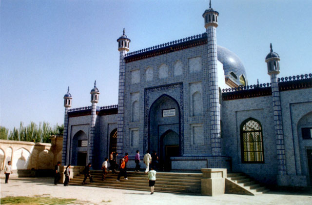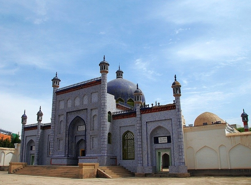 禮拜殿為平頂,主墓室是綠琉璃圓頂;而且其東部建筑中所用塔樓(邦克樓)甚多,約10余座,為新疆同類建筑中少見;塔樓的制作精美可觀,也是建筑裝飾。整個(gè)建筑群高低相間,主次分明,形成一完整的群體。墓室外墻以藍(lán)底白花琉璃磚貼面,禮拜殿木柱的雕刻花紋古拙奇特,紋樣豐美,與一般制作方法不同,都是新疆伊斯蘭建筑中難得的精品,為后世所罕見,體現(xiàn)出古代維吾爾工匠的高超技藝和杰出才能.