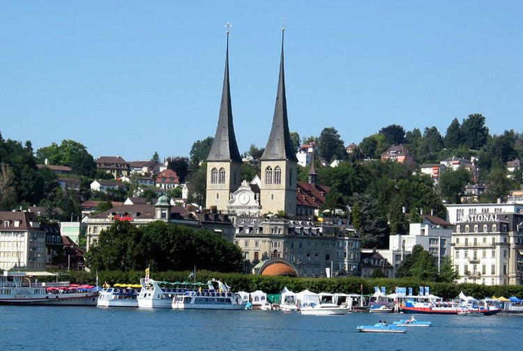 有兩座美麗尖塔的豪夫教堂(Hofkirche),位于盧塞恩湖的北面,是盧塞恩最重要的教堂。公元735年開始建造,是羅馬式建筑,到14世紀(jì)改建為哥特式,17世紀(jì)的一場大火中受到了嚴(yán)重破壞,隨后又改建為文藝復(fù)興式。教堂內(nèi)部莊嚴(yán)肅穆,禮拜席上有生動細(xì)膩的雕刻圖案。教堂的管風(fēng)琴,1640年制造,共有4950根風(fēng)琴管,至今仍在盧塞恩的夏季音樂節(jié)上使用。