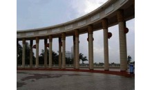 湛江海濱公園位于霞山區(qū)東北角海濱,這里有細白的沙灘、湛藍的海水、挺拔的椰樹,如茵的芳草,鮮艷的花卉。富有亞熱帶海洋風光,被稱為湛江的“城市客廳”。時代廣場就是公園的大門。大門為歐式建筑風格,由二十根圓柱頂起一弧形柱廊,上方鑲嵌著九幅漢白玉浮雕,浮雕描繪了湛江百年歷史,廣場地面用紅、褐、灰三色馬賽克拚成一幅世界地圖。