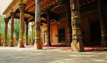 默拉納額什丁墓在庫車新老城之間。默拉納是圣人后商的意思。額什丁相傳為伊斯蘭教之始祖,在宋理宗時(shí)來庫車傳布伊斯蘭教,死后葬此。建有祠宇、分祠門、祠堂、墓門和墓室四部門、全部以綠色琉磚裝飾,是曲型的伊斯蘭教建筑,頗為壯麗。祠西廊下有匾額,上書 “天方列圣”四個(gè)大字。