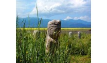 三海子墓葬及鹿石位于新疆維吾爾自治區(qū)青河縣查干郭愣鄉(xiāng)三海子夏牧場,為青銅時(shí)代的一處墓葬,距今約4000年。在面積約16.25平方公里地域的四個(gè)分布區(qū)內(nèi)計(jì)有石圍石堆墓、石棺墓30余座,鹿石19通。什巴爾庫勒石圍石堆墓,石堆直徑78米,殘高25米;石圍直徑210米,寬3~5米。石堆與石圍之間有四條片石鋪成的通道,最寬的通道達(dá)1.6米。墓環(huán)水而建,氣勢宏偉,結(jié)構(gòu)獨(dú)特,是歐亞草原少有的特大規(guī)模墓冢之一。