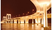 澳門“友誼大橋”,工程原稱新澳氹大橋,1994年初建成通車。位于舊大橋(嘉樂庇總督大橋)以東,連接澳門半島新口岸水塘北角(外港碼頭處)與氹仔北安碼頭。橋?qū)?5米,設(shè)兩條雙線車道,中設(shè)分隔線,車道兩旁設(shè)1.5米寬的行人道。
