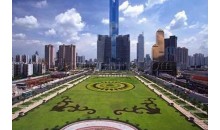 天河?xùn)|站綠化廣場位于廣州市新城市軸線上,占地面積4.7萬平方米,于1998年9月中旬動(dòng)工,1999年7月1日正式完成并交付使用。廣場中央綠地2.6萬平方米,鋪種馬尼拉草18315平方米,其中有6000平方米種植標(biāo)志性的紋樣,分圍種植1300平方米的福建茶綠籬。中央草坪四周設(shè)有41個(gè)花池,24個(gè)柵池,24個(gè)花缽,廣場綠化率達(dá)82%。仿南越王墓制式花壇,遍植各種嶺南花卉。