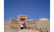 煙云燎繞的火焰山下,郁郁蔥蔥的木頭溝畔,一座規(guī)模宏大的人文 景觀,以其獨特的藝術(shù)風(fēng)格,屹立在312國道西側(cè),它就是1991年5月對 外開放接待游人的新疆大漠土藝館, 地理坐標(biāo)89°32′7″E,42°56′ 8″N,海拔140米,由312國道的勝金口往北拐上前往柏孜克里克干佛洞的旅游專線公 路四公里處,便可看到大型停車場后的高坡上矗立著一座高大的民族風(fēng)格建筑群,正中是十四米高的磚砌圖案大門.