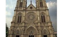 廣州石室天主教堂在市區(qū)一德路,清同治二年奠基,光緒十四年落成,歷時二十五年,是全國最大的一座以高直尖頂為特色的哥特式教堂。教堂結構為一巍峨高聳的雙尖石塔,其上掛有大鐘一組,堂深78.69米,東西寬35米,高度由地面至天面平臺為28.7米,由天面平臺至塔頂端為29.8米,共高58.5米,堂內是尖形肋骨尖叉的拱形穹窿,正面的大門和四周玻璃鑲嵌,可避免室外強光射入,使室內光線保持柔和。