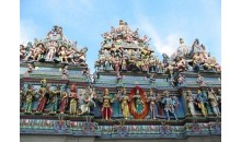 維拉瑪卡里雅曼興都廟(Sri Veeramakliaman Temple)建于1855年。特殊的彩繪門(mén)樓屬典型的南印度建筑風(fēng)格,門(mén)上高聳的塔樓上裝飾許多立體的彩色神像,廟里則是供奉主掌生死的"卡莉女神"(Kali)。雕刻在門(mén)樓上的印度教諸神與圣物牛、斗士等,在太陽(yáng)的照耀下閃閃發(fā)光,耀人眼目。寺廟周?chē)膲Ρ?,都被涂成紅白色,極富喜慶氣氛。